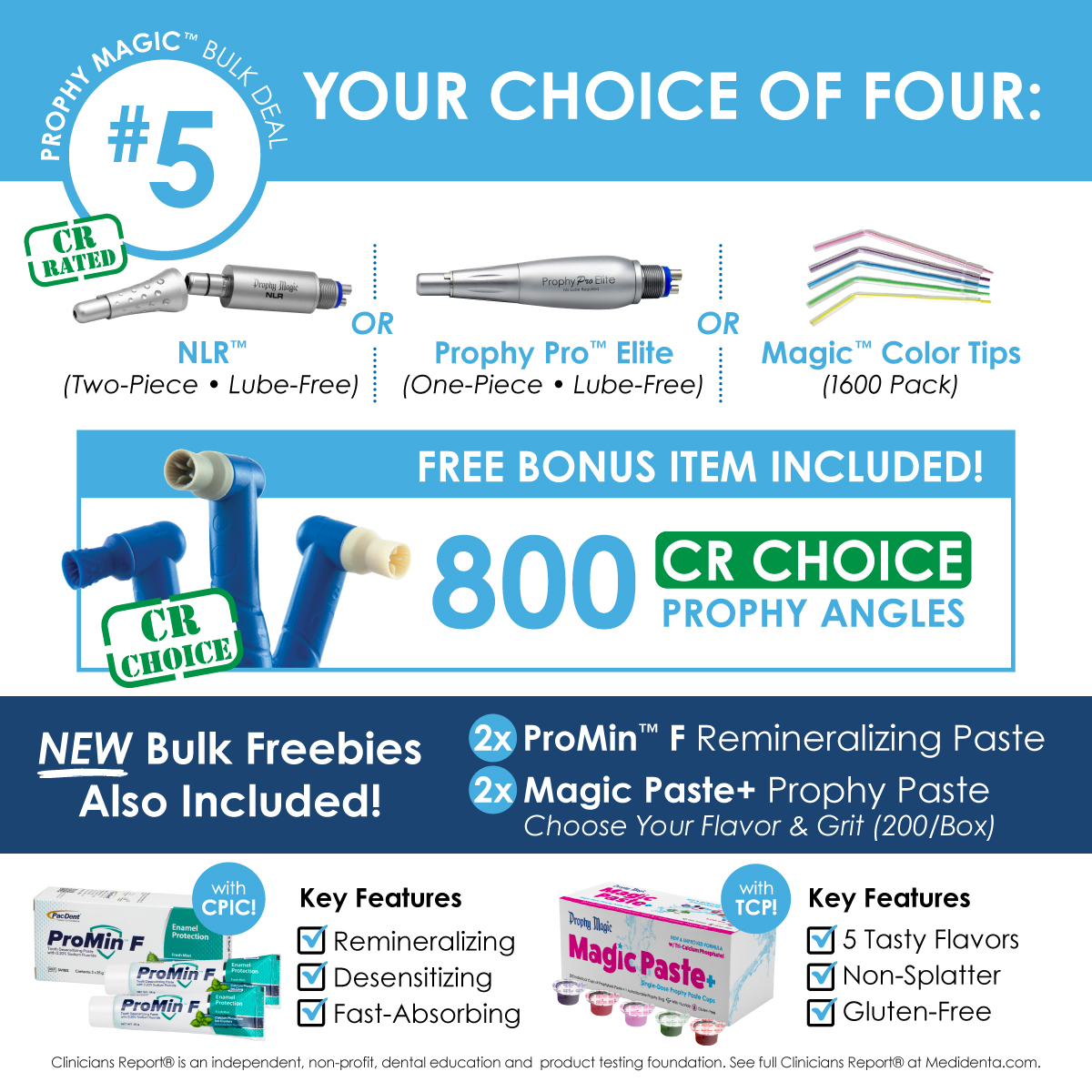 - 8 Packs / 800 CR-Choice Prophy Magic Prophy Angles: Latex-free, disposable angles in soft, hard, or Mystic cup options. Featuring ergonomic grips and unique gearing for chatter-free operation, these angles provide enhanced flare for subgingival and interproximal access, ideal for removing plaque, stains, and tartar.